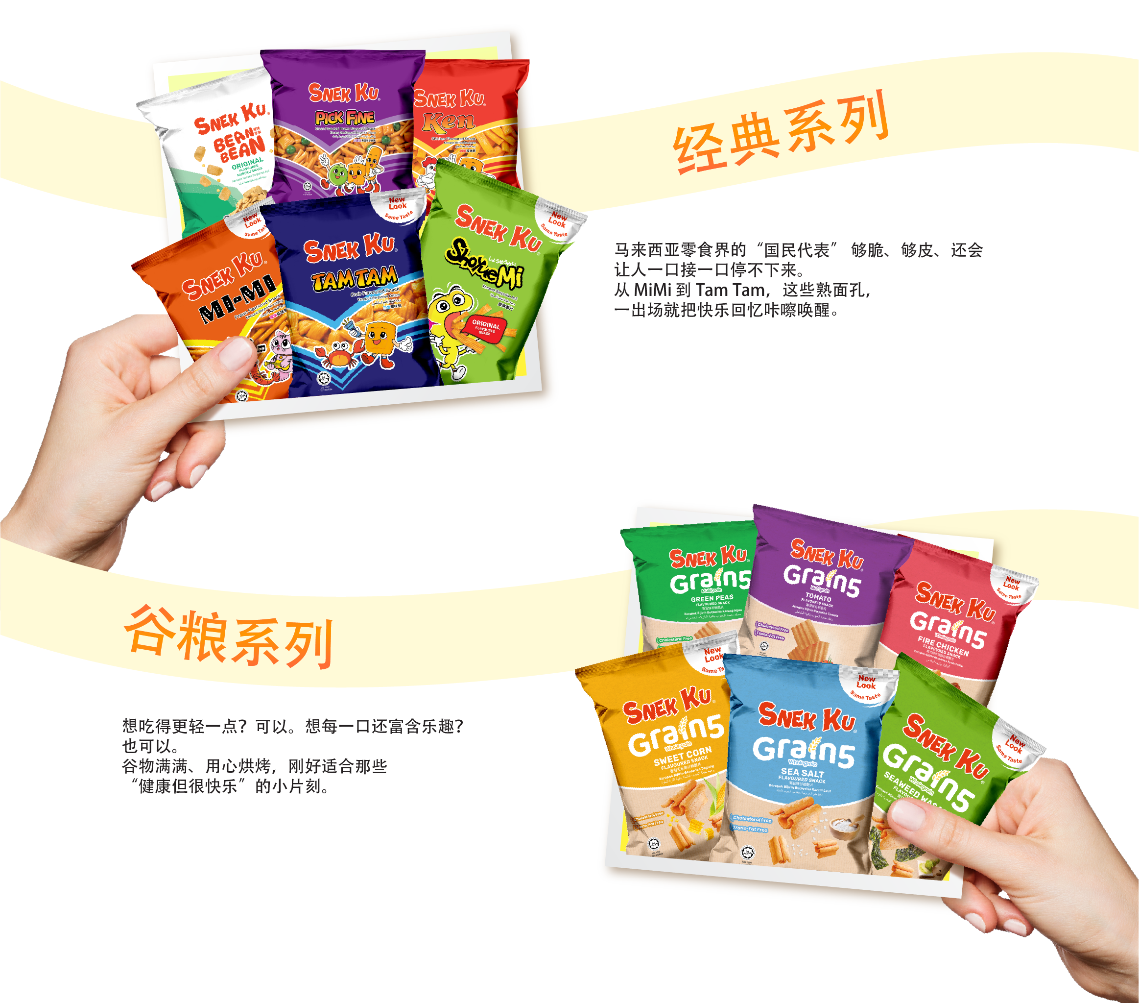 从经典酥脆的熟悉滋味,到健康酥脆的轻盈口感,Snek Ku 满足你每一种想吃的时刻。